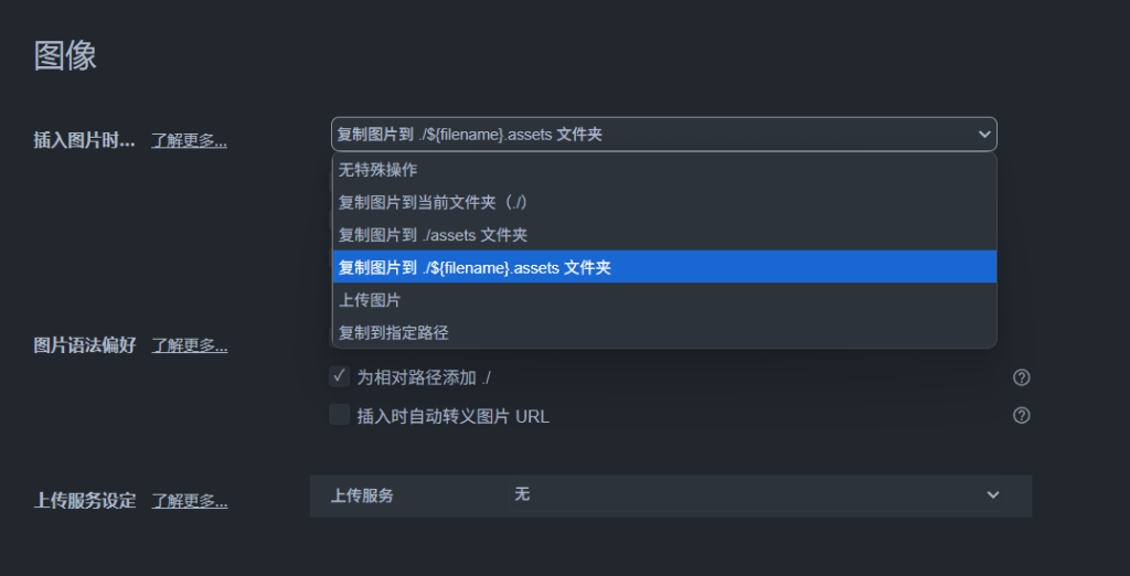 注意,如果你希望本地的图片便于管理,需要像上图一样选择,如果你希望分享给他人时图片不会出问题,尽量使用相对路径