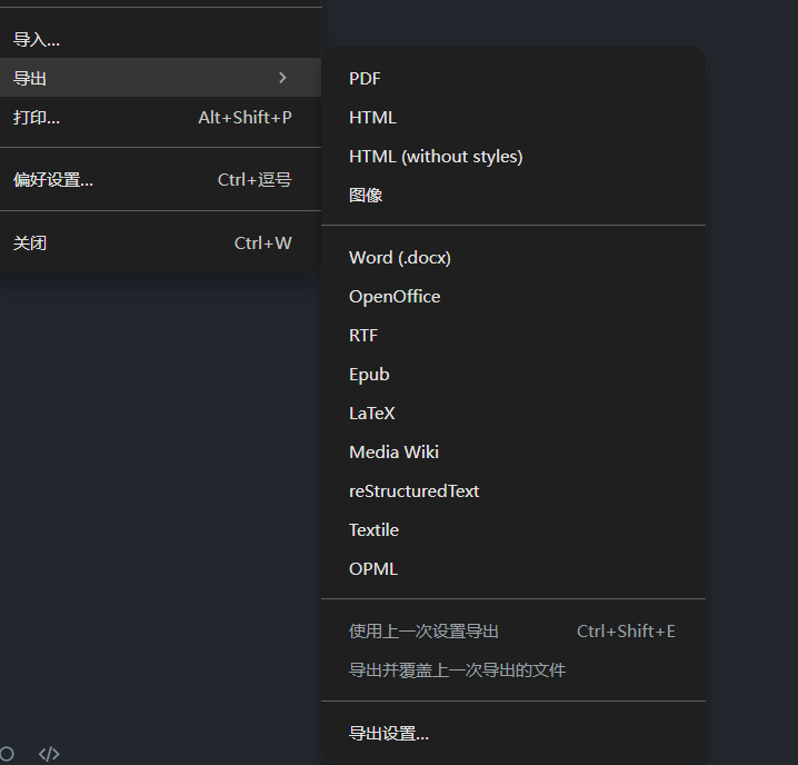 导出可选这些格式,如果想要部署在网站上,请选择 HTML(without styles)